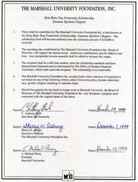 In 1999 the alumni brothers of the Gamma Epsilon Chapter of the Zeta Beta Tau Fraternity at Marshall University established a scholarship fund to provide support to students with financial need. The fund was endowed in 2000 after reaching $10,000. The purpose of the fund is to: